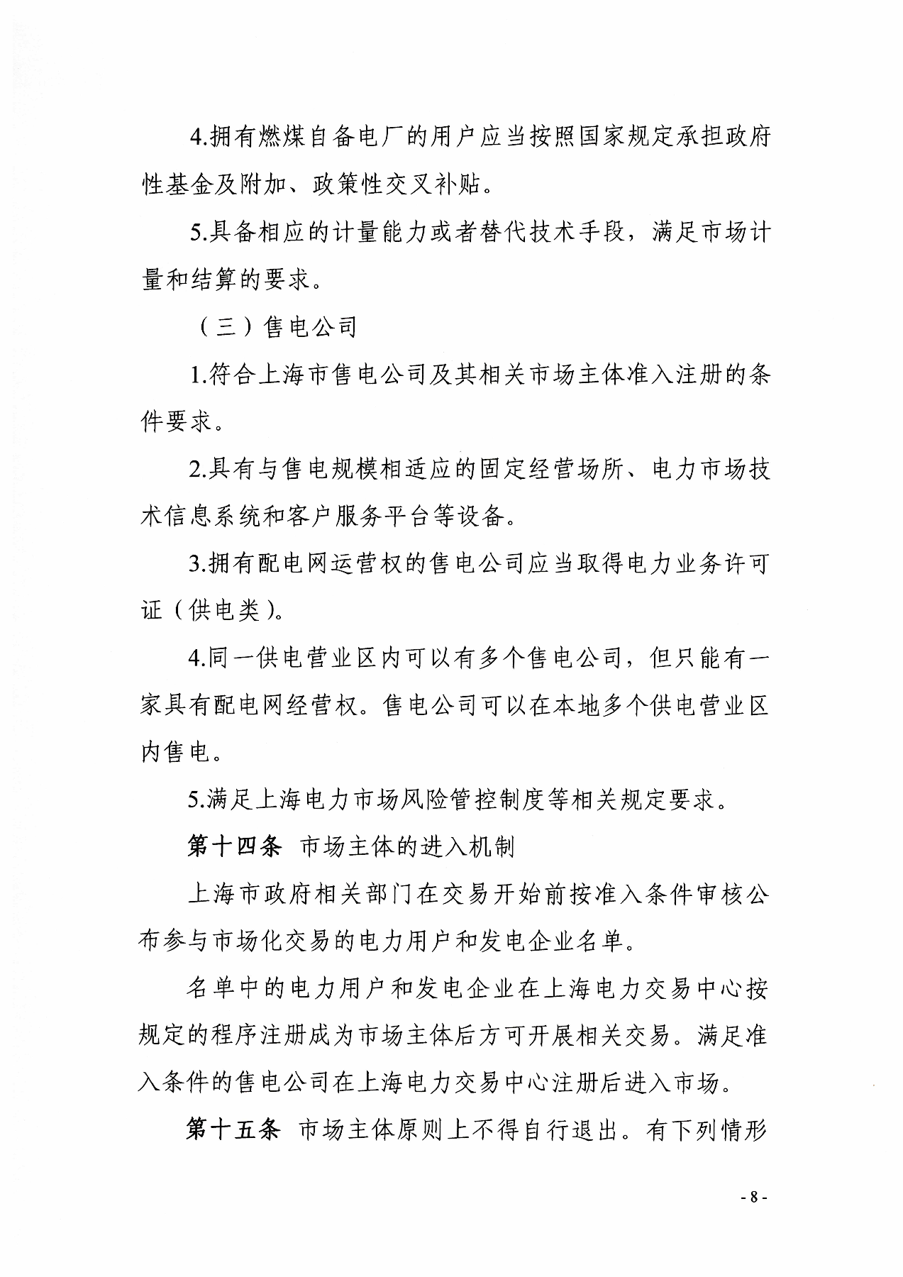 售电公司:符合上海市售电公司及其相关市场主体准入注册的条件要求。具有与售电规模相适应的固定经营场所、电力市场技术信息系统和客户服务平台等设备。拥有配电网运营权的售电公司应当取得电力业务许可证(供电类)。